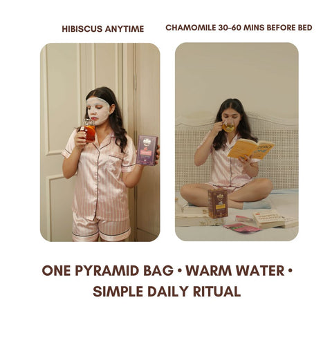 Enjoy Hibiscus anytime and Chamomile 30–60 minutes before bedtime.